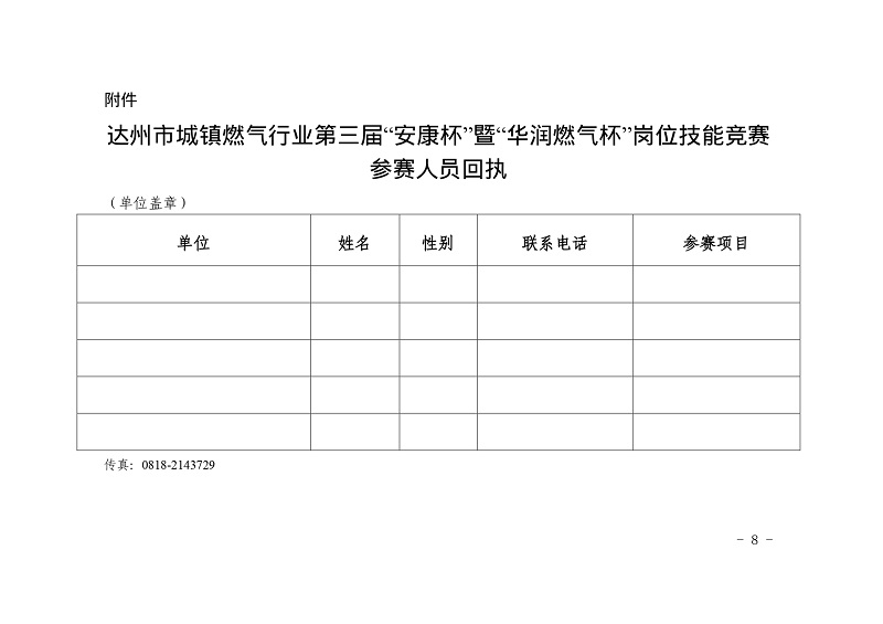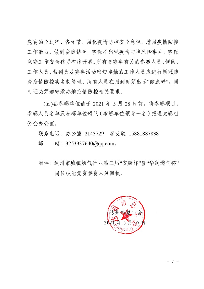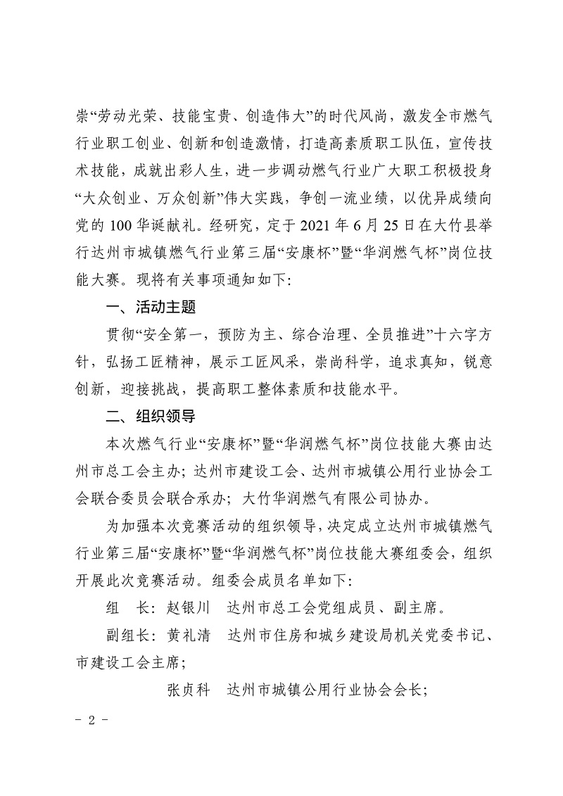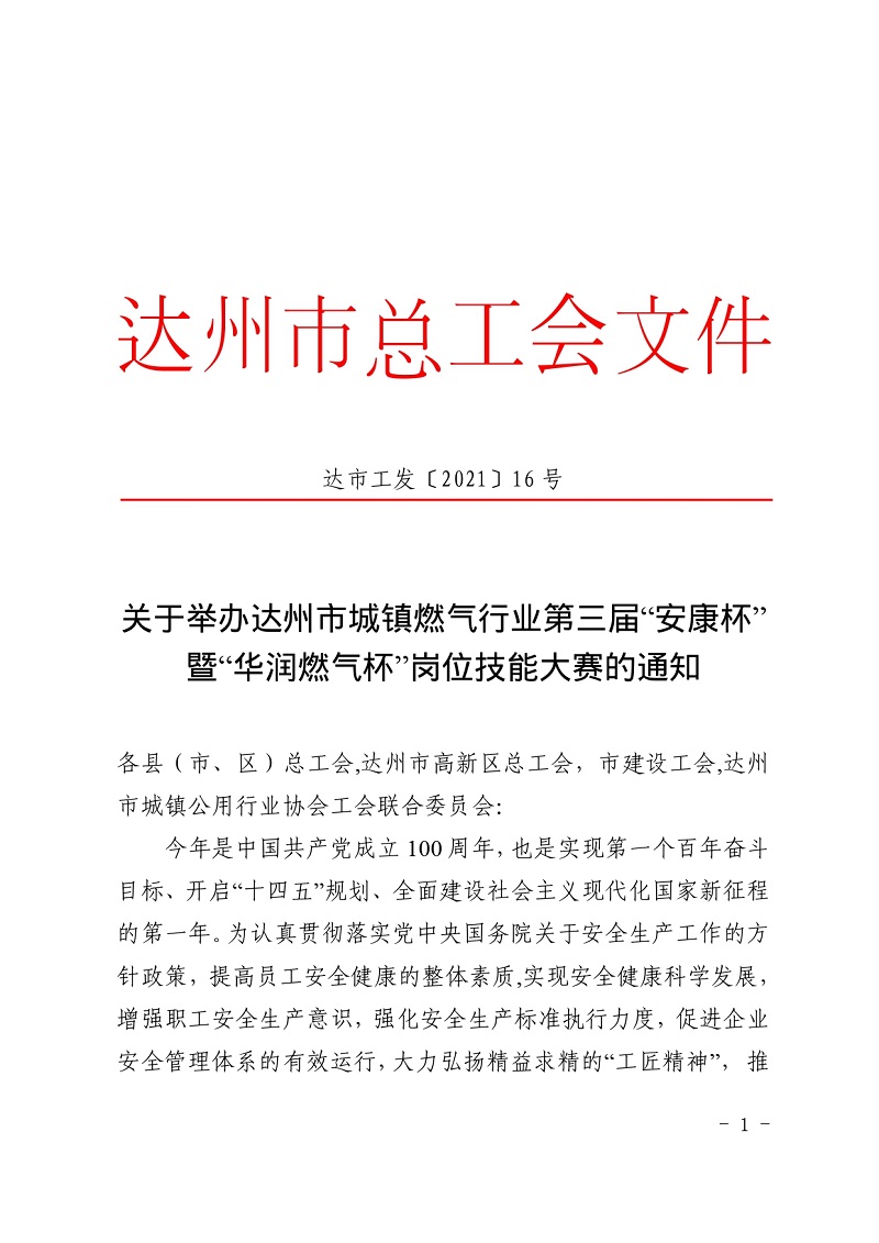 達(dá)州市總工會(huì)關(guān)于開(kāi)展達(dá)州市城鎮(zhèn)燃?xì)庑袠I(yè)第三屆“安康杯”暨“華潤(rùn)燃?xì)獗睄徫患寄艽筚惖耐ㄖ?
