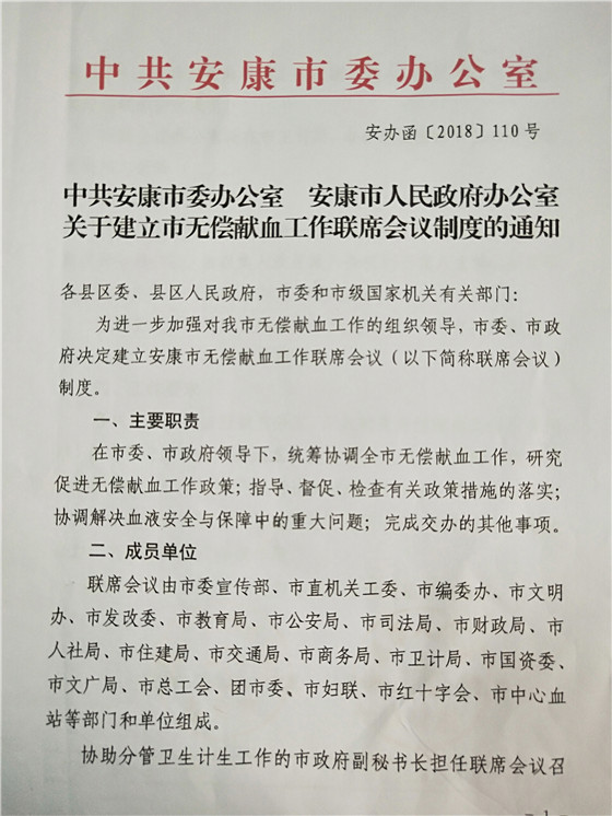 2、安康市率先在全省建立首個(gè)無(wú)償獻(xiàn)血聯(lián)系會(huì)議制度 安康無(wú)償獻(xiàn)血聯(lián)席會(huì)議制度是在安康市委、市政府領(lǐng)導(dǎo)下,由市委宣傳部等21個(gè)市級(jí)部門和單位組成,協(xié)助分管衛(wèi)生計(jì)生工作的市政府副秘書長(zhǎng)擔(dān)任聯(lián)席會(huì)議召集人。聯(lián)席會(huì)議每年召開一次全體會(huì)議,主要職責(zé)為統(tǒng)籌協(xié)調(diào)全市無(wú)償獻(xiàn)血工作,研究促進(jìn)無(wú)償獻(xiàn)血工作相關(guān)政策,指導(dǎo)、督促、檢查有關(guān)政策措施的執(zhí)行落實(shí),協(xié)調(diào)解決血液安全與保障中的重大問題。聯(lián)系會(huì)議制度的建立,標(biāo)志著我市無(wú)償獻(xiàn)血宣傳招募模式“政府主導(dǎo)、部門協(xié)作、社會(huì)參與、城鄉(xiāng)聯(lián)動(dòng)”的發(fā)展格局和長(zhǎng)效機(jī)制得到進(jìn)一步鞏固和提升。