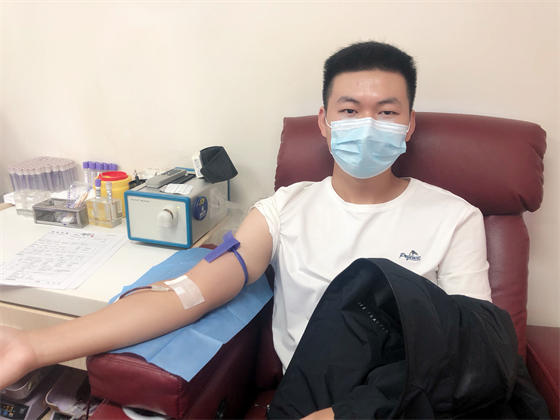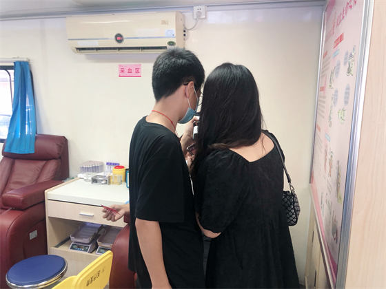 中秋節(jié)不僅街上熱鬧,獻(xiàn)血車上也熱鬧,鄧孟杰正坐在采血椅上獻(xiàn)血,他漂亮大方的女友站在旁邊跟他聊著晚上要吃什么,女友的弟弟坐在遠(yuǎn)一點(diǎn)的地方玩著手機(jī),女友的媽媽則坐在體檢桌前測量血壓,“一人獻(xiàn)血,三人陪同”的場景著實(shí)有點(diǎn)可愛,但鄧孟杰笑得十分開心,一直想獻(xiàn)血的他特別選了中秋這個(gè)日子,大概也是想和愛人親人一起分享這種美妙的人生體驗(yàn)。鄧孟杰的女友拿起他的獻(xiàn)血證撒嬌到:“這次我們陪你,下次你也要陪我來獻(xiàn)血?!闭f完把手機(jī)塞給了一旁的弟弟,指揮他給自己和男友拍合照,一邊打趣弟弟拍照技術(shù)不好一邊把男友手里獻(xiàn)血證的位置調(diào)了又調(diào)。