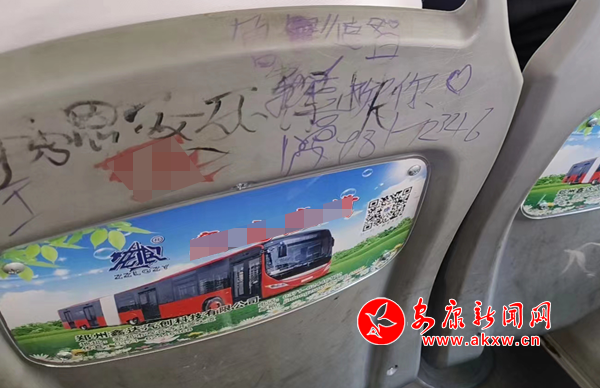 7月7日,筆者乘坐安康市城區(qū)7路公交車發(fā)現(xiàn),公交座椅靠背慘遭“涂鴉”,內(nèi)容不乏廣告標語、低俗粗鄙、不堪入目的語言,嚴重影響乘車心情。希望廣大乘客文明乘車,還市民一個干凈整潔的乘車環(huán)境。(通訊員 成忠旭)