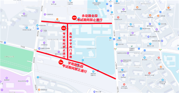 高新中學所處的學苑路東段、永定路全段、高新中學西側道路進行交通管制,禁止所有車輛通行。
