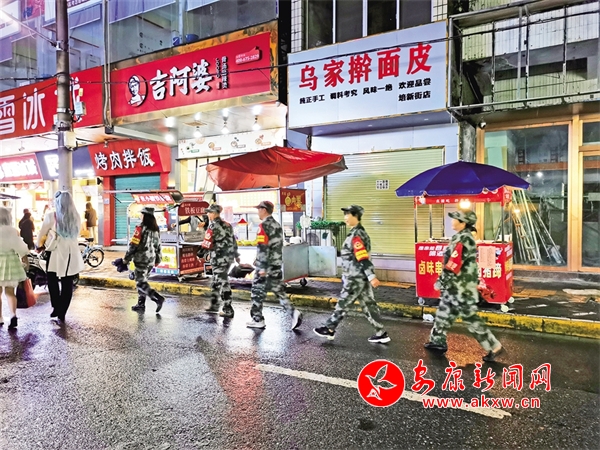 10月1日,志愿服務(wù)隊(duì)在中心城區(qū)培新街開展夜間巡邏。潘潤生 攝