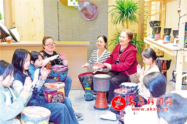 國慶期間,漢陰雙河口古鎮(zhèn)游客爆滿。圖為游客在古鎮(zhèn)手鼓店體驗(yàn)打手鼓。陳浩 攝