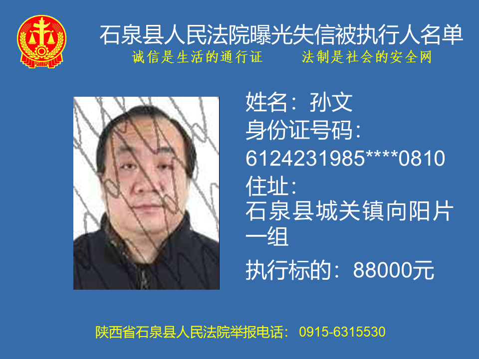 為了進(jìn)一步加大執(zhí)行力度,保障勝訴當(dāng)事人的合法權(quán)益,推進(jìn)社會誠信體系建設(shè),依照《中華人民共和國民事訴訟法》、《最高人民法院關(guān)于公布失信被執(zhí)行人名單信息的若干規(guī)定》等法律、司法解釋的有關(guān)規(guī)定,現(xiàn)對一批已進(jìn)入執(zhí)行程序,且尚未全部履行義務(wù)的被執(zhí)行人進(jìn)行媒體曝光,歡迎廣大群眾支持石泉縣人民法院的工作,向我院提供被執(zhí)行人的財產(chǎn)線索,使生效法律文書能夠得到切實(shí)執(zhí)行,讓人民群眾切實(shí)感受到公平正義就在身邊。