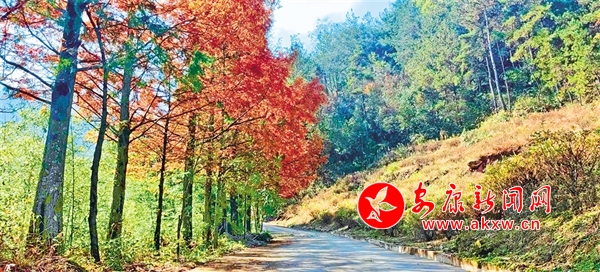 車子沿著山路繼續(xù)往上,途中時不時掠過一排排水杉,水杉的顏色有綠有黃、有深有淺,高大挺拔、直入云端。偶爾有幾棵同類型品種夾雜其中,已全然呈現(xiàn)出上下一體的棕黃色。在太陽的照射下,仿佛是身披金黃鎧甲的戰(zhàn)士,堅韌有力。枝葉在微風中輕搖,沙沙地響,視聽一體的感覺,不覺教人沉醉其中。