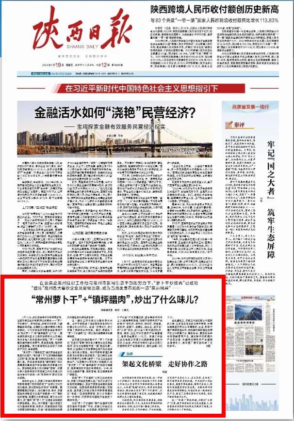 1月19日《陜西日?qǐng)?bào)》頭版刊發(fā)文章《“常州蘿卜干”+“鎮(zhèn)坪臘肉”,炒出了什么味兒?》,報(bào)道鎮(zhèn)坪縣聯(lián)手常州市以文化賦能“土特產(chǎn)”,讓蘇陜協(xié)作更出彩!