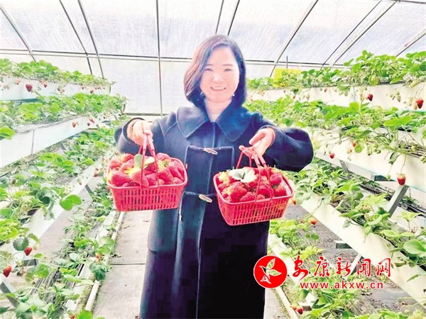 走進(jìn)大棚,草莓特有的清香味撲鼻而來,新型的鋼架種植平臺(tái)一線排開、高低錯(cuò)落,一壟壟長勢(shì)茂盛的草莓秧苗嫩綠清新,一顆顆飽滿透紅的草莓點(diǎn)綴于綠葉之間,幾名游客正在仔細(xì)地采摘著成熟的果實(shí)?!斑@草莓聞起香,吃起來甜!在這采摘草莓還不用彎腰,不費(fèi)勁。”游客高女士說。