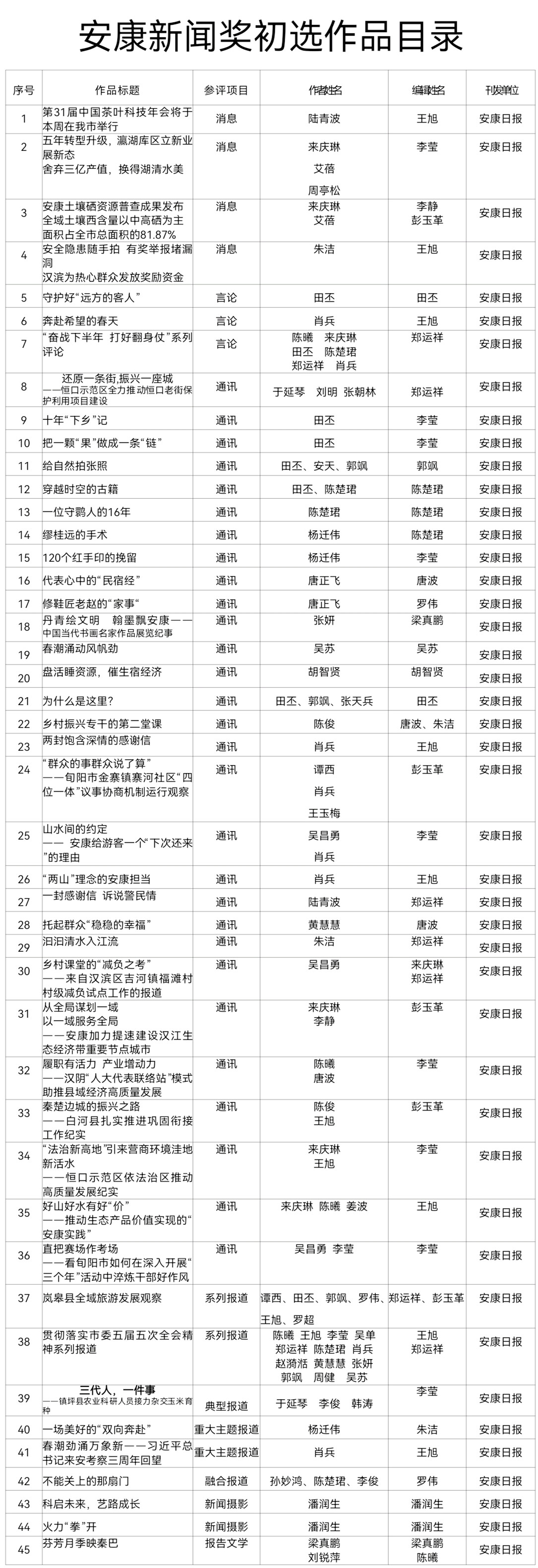 經(jīng)過3月20日編委會(huì)推薦、社黨委研究決定,擬推薦以下45件新聞作品參評(píng)2023年度“安康新聞獎(jiǎng)”。公示時(shí)間從2024年3月21日至2024年3月27日,公示期5個(gè)工作日。如有不同意見,請(qǐng)向安康日?qǐng)?bào)社機(jī)關(guān)紀(jì)委、新聞管理部反映。