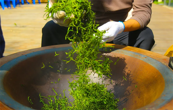 翠屏島瀛湖茶舍,我們推出了圍爐煮茶項(xiàng)目,炒茶師傅現(xiàn)場(chǎng)殺青、揉捻、干燥,隨后將瀛湖的明前茶呈送到游客面前。當(dāng)然,游客若有興趣,也可親自實(shí)操這難能可貴的體驗(yàn)。