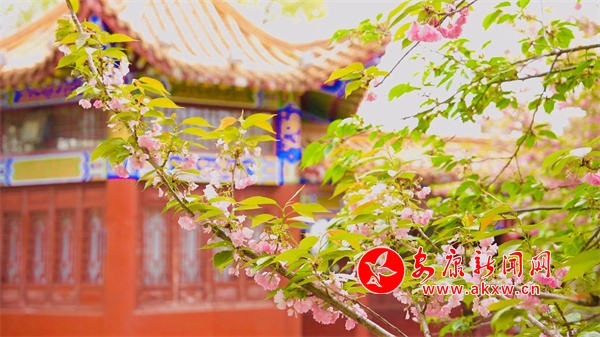 在龍崗閣兩側,淺白和粉紅的櫻花一團團、一簇簇在藍天白云的映襯下,在枝頭舞蹈,伴隨著微風,陣陣花香四溢,沁人心脾。置身其間,繁花耀眼,香飄四溢,唯美景色引人入勝。