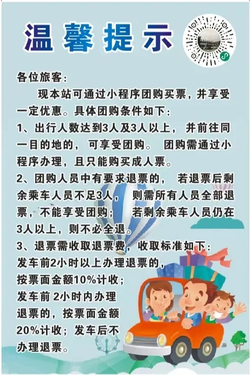 新增團(tuán)購小程序,目前開啟安康——紫陽團(tuán)購票,紫陽全程68公里,途經(jīng)包茂高速,運(yùn)行大約1小時(shí)。票價(jià)最低20元起,三人可成團(tuán),購票更優(yōu)惠!下方圖片內(nèi)二維碼可快速購買。