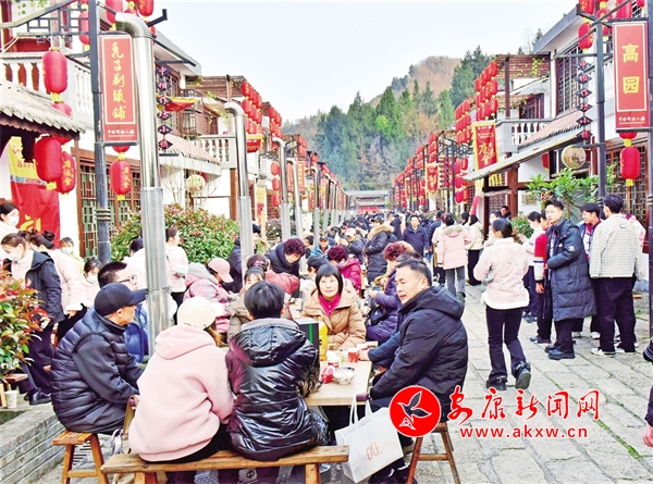“開席啰……”隨著一聲鑼響,充滿儀式感的省級非遺庖湯盛宴正式開始。古色古香的店鋪門頭掛滿紅燈籠,石板鋪成的長街上,賓客8人一桌圍爐而坐,道道美食依次上席,說菜人“口吐蓮花”,菜越說越香;酒歌高亢,越喝越暖;猜拳行令,秦巴漢子盡顯豪邁風(fēng)采;作坊小鎮(zhèn)高朋滿座,滿滿年味十里香飄。