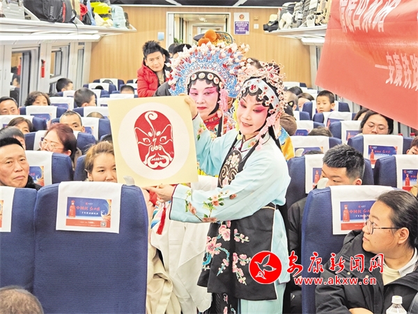 火車穿越秦巴山水間,途中,來自安康漢調(diào)二黃研究院的專業(yè)演員和地方民間漢調(diào)二黃愛好者們一同表演了國家級非物質(zhì)文化遺產(chǎn)——漢調(diào)二黃經(jīng)典戲曲演唱,并為旅客們講解漢調(diào)二黃戲曲知識,與旅客們開展互動交流,讓旅客親身體驗漢調(diào)二黃戲服道具,感受漢調(diào)二黃的獨(dú)特藝術(shù)魅力。來自漢濱區(qū)文化館的漢濱剪紙技藝傳承人為旅客們展示講解了安康市級非物質(zhì)文化遺產(chǎn)——漢濱剪紙技藝,向參與互動的旅客送上了親手創(chuàng)作的漢濱剪紙作品,提前送上新春祝福。活動中,西安鐵路公安局安康公安處的民警們和文藝工作者們一同宣傳普及了反詐知識,進(jìn)一步提升旅客的安全防范意識。