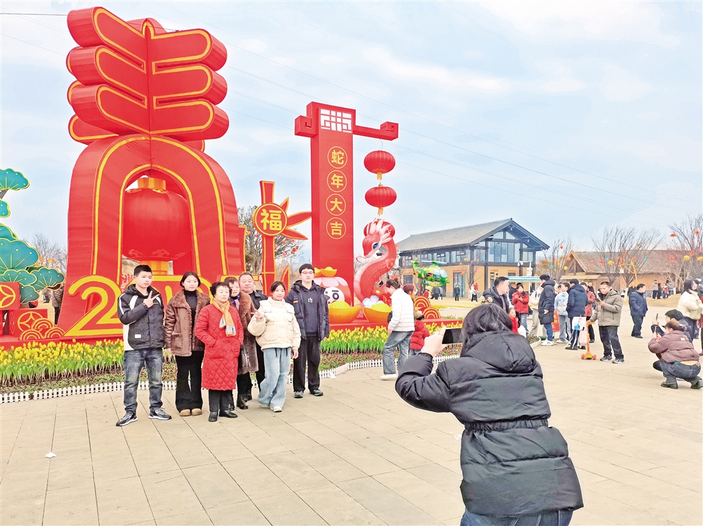 春節(jié)假日期間,安康高新區(qū)桃花源景區(qū)年味兒濃厚。圖為游客在景區(qū)巨幅“春”字景觀燈前拍照留影。(陳榮斌 攝)
