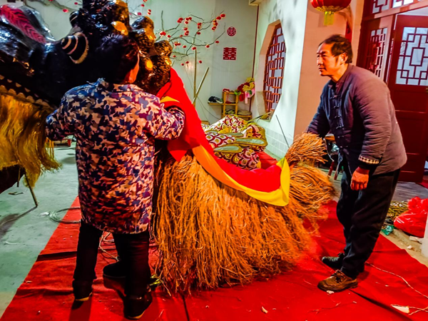 2月1日,大年初四,大家還沉浸在新年快樂(lè)中。喧天彩排鑼鼓一敲,嘹亮嗩吶一響,在雙河鎮(zhèn)政府的號(hào)召下,李忠寶帶著一群表演經(jīng)驗(yàn)豐富的文藝骨干、朝氣蓬勃的青年學(xué)生,換上演出行頭,帶著自制的花燈道具,開(kāi)始李氏花燈游演排練。在現(xiàn)場(chǎng),彩色中國(guó)龍游動(dòng)、翻滾、盤踞,不停地變換著花樣;獅子騰躍、回旋、直立,時(shí)而威風(fēng)凜凜、時(shí)而憨態(tài)可掬……