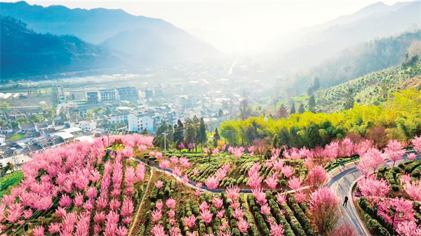 沿著茶山步道拾級(jí)而上,茶農(nóng)采青的竹簍與游人拍照的紗巾在梯田間次第閃現(xiàn)。粉白相間的梅花如云絮般綴滿枝頭,風(fēng)過(guò)處,花瓣簌簌落入茶叢,為嫩綠的新芽染上淡淡馨香。遠(yuǎn)處黛瓦白墻的徽派民居與近處起伏的茶壟構(gòu)成天然畫(huà)框,無(wú)人機(jī)視角下,蜿蜒的茶道如同玉帶纏繞山腰,將紅楓、櫻花、梅林串成斑斕的珠鏈。