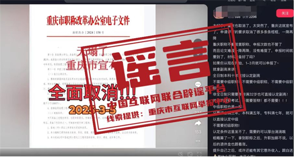 真相:近日,有網(wǎng)民在互聯(lián)網(wǎng)平臺(tái)發(fā)布消息稱“重慶市宣布,申請(qǐng)?jiān)u審的要求取消了很多條條框框,職稱申請(qǐng)不看前置職稱,全日制本科十年直接認(rèn)定副高,不需要中級(jí)職稱”,引發(fā)關(guān)注。經(jīng)核實(shí),網(wǎng)傳信息系謠言。職稱評(píng)審均需逐級(jí)晉升,取得上一級(jí)職稱并滿足相應(yīng)學(xué)歷資歷條件后方可晉升高一級(jí)職稱。目前重慶市除特殊人才、博士后等3個(gè)針對(duì)特定對(duì)象的職稱申報(bào)綠色通道外,正常申報(bào)通道均需逐級(jí)晉升。網(wǎng)傳文件是網(wǎng)民通過(guò)P圖軟件編輯而成,試圖吸引不明真相的群眾咨詢,借機(jī)推銷(xiāo)職稱代辦服務(wù),收取高額費(fèi)用。目前,謠言線索已轉(zhuǎn)交公安機(jī)關(guān)進(jìn)一步調(diào)查處置。(來(lái)源:“重慶辟謠”微信公眾號(hào))