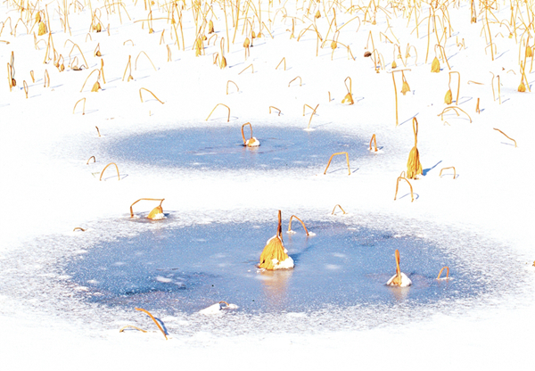 我的攝影創(chuàng)作圍繞生命的痕跡、時間的隱喻兩個主題。在《嘉實(shí)擷芳·野圃瑤音》中,菜園的微觀生態(tài)被賦予交響樂般的節(jié)奏——葫蘆藤的螺旋曲線是生命的律動,西紅柿根莖的垂直排列是生長的秩序,蚜蟲蝕痕的細(xì)節(jié)則暗喻生態(tài)的共生與抗?fàn)帯6凇冻武翳啊ど吃滤莨狻防?,榮成海岸的冬夏對比成為時間的隱喻,結(jié)冰湖面上的凋敗蓮蓬是流逝凝固的時光,夏日海邊的金色水洼則是流動的永恒。我癡迷于捕捉這種矛盾與共生——就像用冷暖色調(diào)碰撞出畫面的張力,也用虛實(shí)構(gòu)圖處理每一張照片,期待每一張照片是個性鮮明,讓人耳目一新。