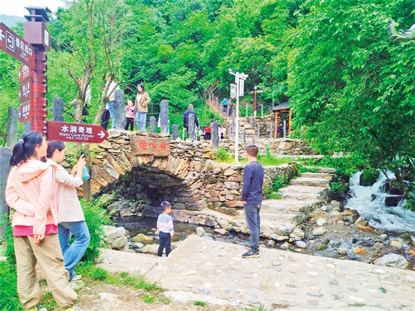 2020年以來,雙河鎮(zhèn)黨委、政府以市場化改革破題,號(hào)召在外創(chuàng)業(yè)能人陳守林等人回鄉(xiāng)協(xié)助開發(fā)水洞溝。“要讓資源變資產(chǎn),首先得打通‘任督二脈’?!标愂亓纸榻B說:“雙河鎮(zhèn)政府累計(jì)投入資金800余萬元,治理景區(qū)河道6公里、鋪設(shè)石板步道4.5公里、搭建石拱橋6座,新建多處公廁,并完善停車場、旅游標(biāo)識(shí)系統(tǒng)等配套基礎(chǔ)設(shè)施?!边@一系列舉措讓“養(yǎng)在深閨”的水洞溝景區(qū),蛻變?yōu)榭蛇M(jìn)入、可游覽、可消費(fèi)的旅游目的地。