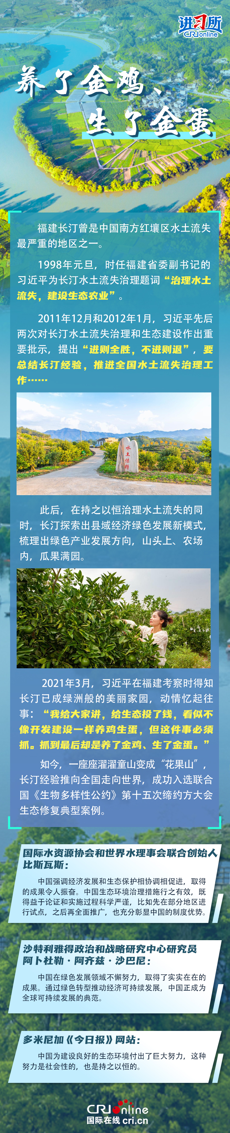 新時代以來,在習(xí)近平生態(tài)文明思想的科學(xué)指引下,“兩山”理念已深入人心,從“點(diǎn)綠成金”的紅樹林到一座座“花果山”,再到走向世界的長汀經(jīng)驗(yàn)……美麗中國建設(shè)邁出重大步伐,生態(tài)環(huán)境保護(hù)發(fā)生歷史性變化。國際社會認(rèn)為,中國取得廣泛的綠色發(fā)展成就,從根本上源于習(xí)近平生態(tài)文明思想,特別是“兩山”理念的指引。在通過綠色轉(zhuǎn)型推動經(jīng)濟(jì)可持續(xù)發(fā)展方面,中國正成為全球可持續(xù)發(fā)展的典范。