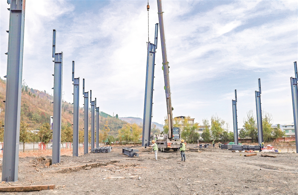 11月26日,紫陽高新區(qū)冷鏈倉儲物流園項目第一批鋼構(gòu)材料進場,工人們正在開展吊裝作業(yè)。 肖昌尉 攝