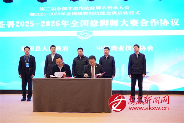 簽約與啟動(dòng)儀式上,紫陽(yáng)縣人民政府與中國(guó)商業(yè)技師協(xié)會(huì)簽署2025—2026年全國(guó)修腳師大賽合作協(xié)議,并共同啟動(dòng)大賽。紫陽(yáng)縣人社局與揚(yáng)州市陸琴腳藝職業(yè)培訓(xùn)學(xué)校簽訂修腳技能培訓(xùn)協(xié)議;現(xiàn)場(chǎng)還舉行了會(huì)旗交接儀式,確定了下一屆承辦單位。