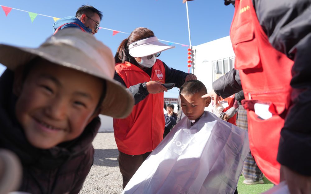 ??2025年1月26日,志愿者在西藏拉孜縣吉如村安置點(diǎn)為孩子們理發(fā)。西藏定日縣6.8級(jí)地震發(fā)生后,志愿者們迅速參與救援搜救、協(xié)助搭建帳篷、搬運(yùn)賑濟(jì)物資、協(xié)調(diào)村民所需。數(shù)百名大學(xué)生組成志愿者服務(wù)隊(duì),白天為安置點(diǎn)的孩子們輔導(dǎo)作業(yè)、陪孩子們運(yùn)動(dòng);晚上組成巡邏隊(duì),守護(hù)安置點(diǎn)的安寧。