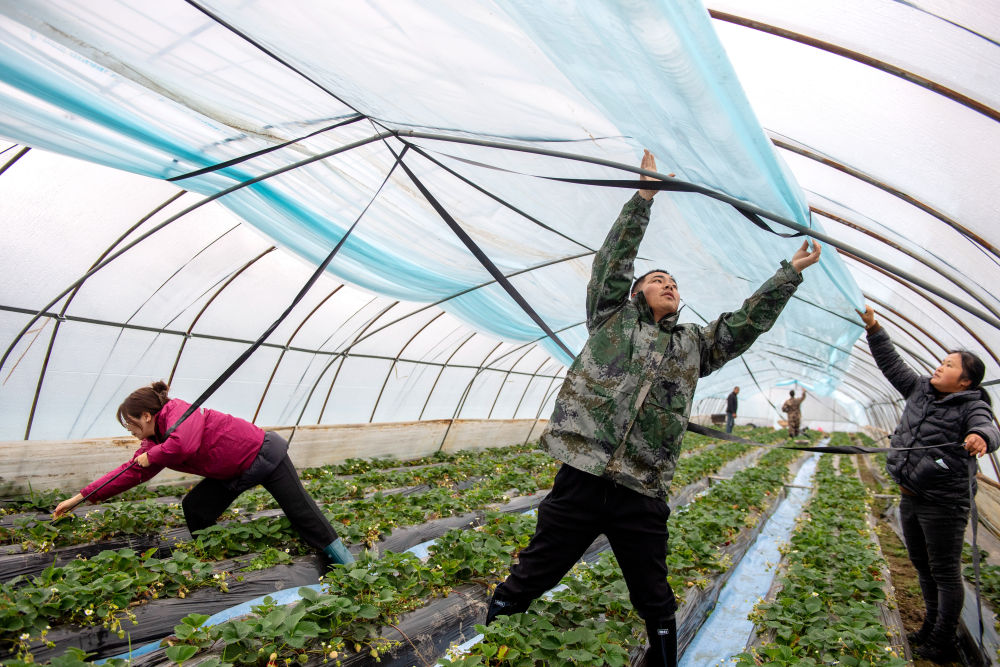 ??2023年12月15日,志愿者在浙江湖州長(zhǎng)興縣水口鄉(xiāng)幫助農(nóng)戶加蓋大棚保溫膜。為應(yīng)對(duì)強(qiáng)雨雪天氣,志愿者們幫助農(nóng)戶清理大棚上的積雪,加裝綁棚繩,棚內(nèi)增設(shè)立柱,提高大棚抗風(fēng)雪能力,確保農(nóng)產(chǎn)品正常生產(chǎn)供應(yīng)。