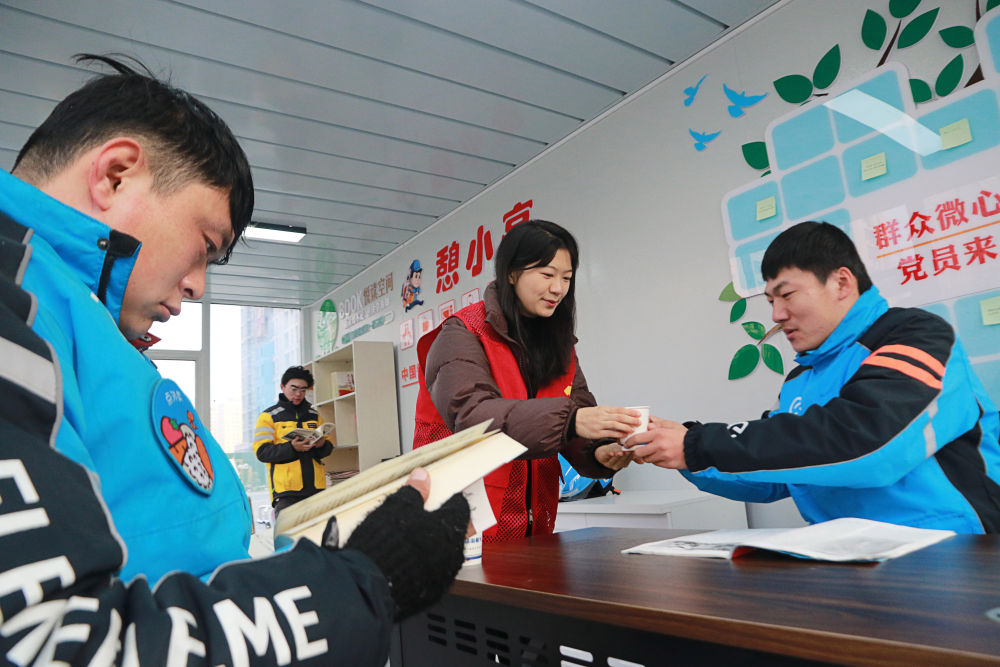 ??2023年12月27日,志愿者在山東省高密市密水街道“憩小亭”服務(wù)站為外賣騎手送上熱水。入冬以來(lái),山東省高密市密水街道推進(jìn)“憩小亭”暖心服務(wù)站建設(shè),為外賣騎手、快遞小哥、網(wǎng)約車司機(jī)、環(huán)衛(wèi)工人等戶外勞動(dòng)者提供飲水、無(wú)線上網(wǎng)、食物加熱等多項(xiàng)服務(wù),讓他們感受到冬日里的溫暖。
