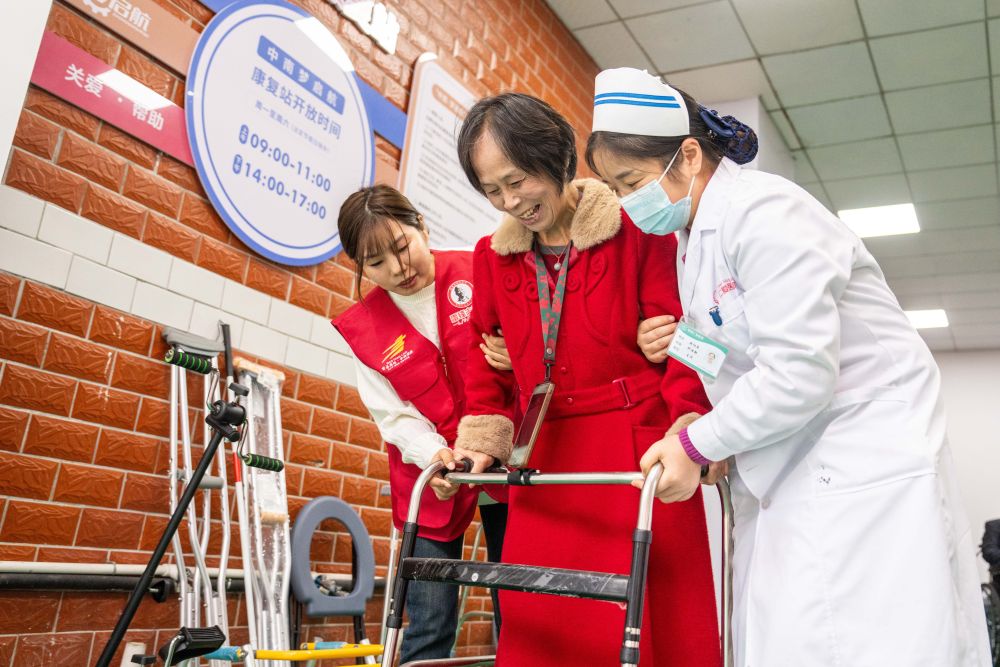 ??2025年11月6日,志愿者及醫(yī)務(wù)人員在湖南長(zhǎng)沙望城區(qū)高塘嶺街道中南社區(qū)幫助行動(dòng)不便的居民使用康復(fù)器具。