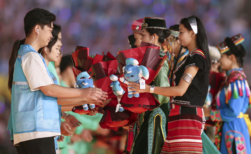 ??2024年11月30日,五十六個(gè)民族代表在海南三亞舉行的第十二屆全國(guó)少數(shù)民族傳統(tǒng)體育運(yùn)動(dòng)會(huì)閉幕式上為志愿者獻(xiàn)花。運(yùn)動(dòng)會(huì)期間,數(shù)千名志愿者“小鹿鹿”奔赴十余個(gè)競(jìng)賽場(chǎng)館、二十多家接待酒店、媒體中心、機(jī)場(chǎng)車站等地,為來(lái)自全國(guó)各地的運(yùn)動(dòng)員、技術(shù)官員、工作人員和觀眾提供禮賓接待、交通引導(dǎo)、安全保衛(wèi)等志愿服務(wù)。