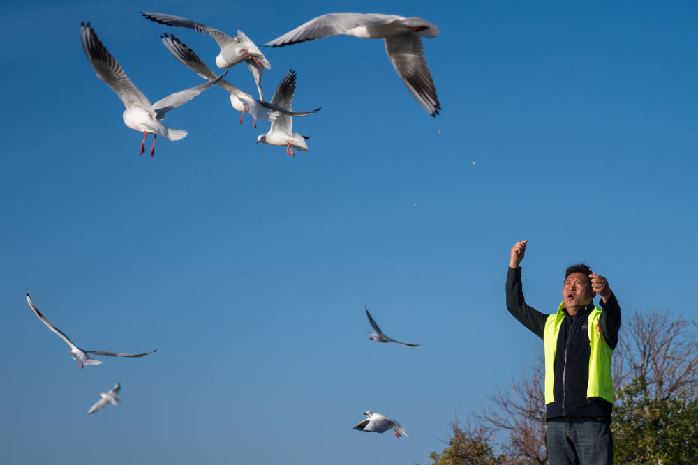 ??2024年12月11日,志愿者張利云在云南昆明王官濕地公園投喂紅嘴鷗。志愿者張利云堅(jiān)持投喂紅嘴鷗長(zhǎng)達(dá)十余年,為生態(tài)環(huán)境保護(hù)貢獻(xiàn)個(gè)人力量。