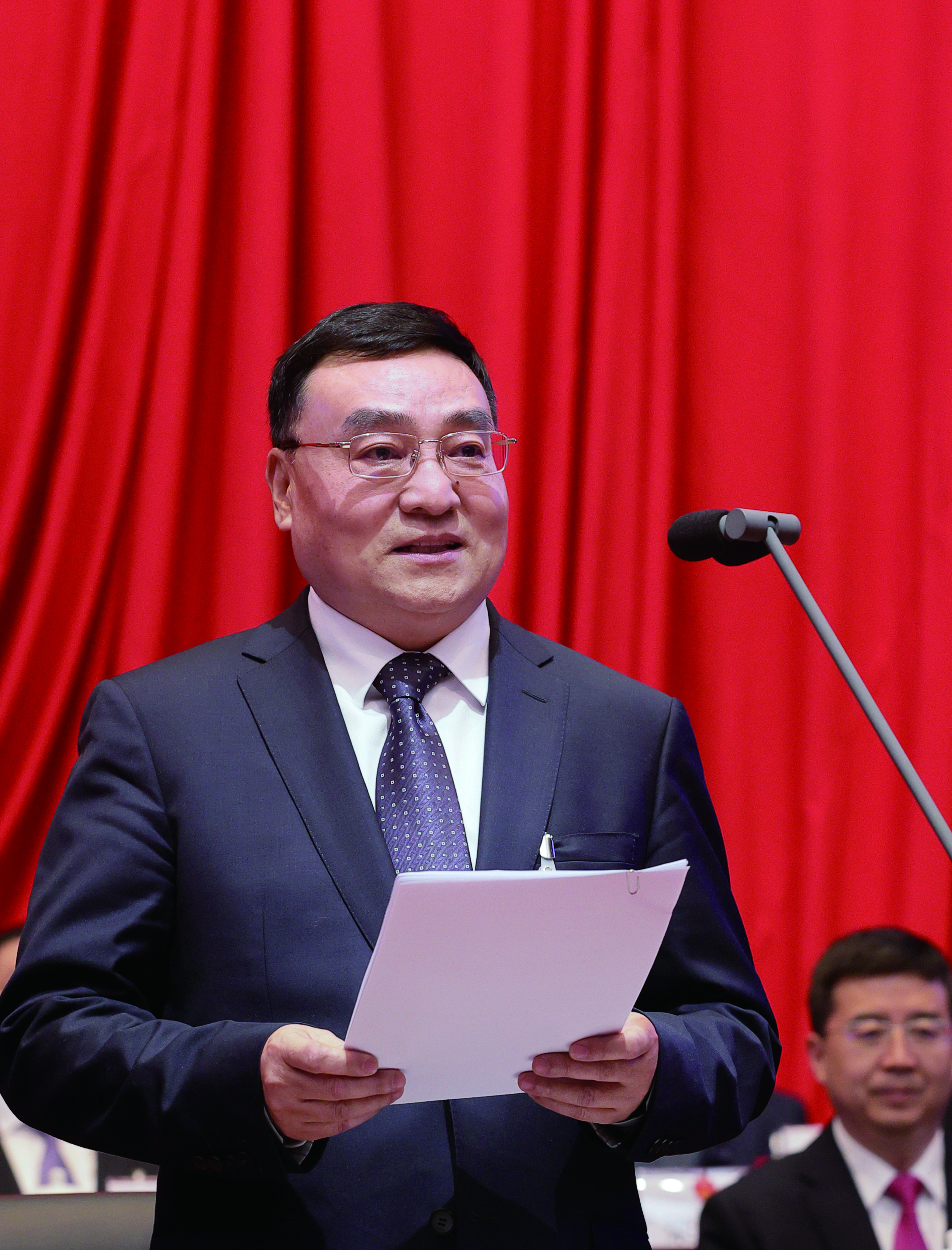 會場氣氛莊重而熱烈,主席臺帷幕正中高懸的國徽在鮮艷的紅旗映襯下熠熠生輝。主席臺對面懸掛“牢記囑托、勇?lián)姑?、開拓創(chuàng)新、拼搏奮進,為在中國式現(xiàn)代化道路上聚力建設幸福安康不懈奮斗!”的橫幅,鼓舞人心、催人奮進。