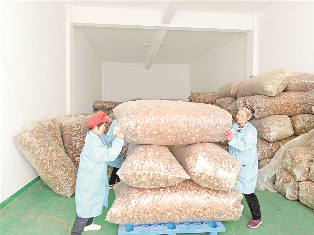 工人封裝、搬運香菇