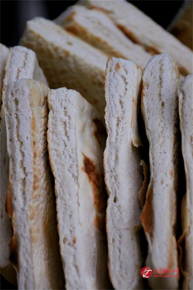 安康的牙牙兒饃是發(fā)面的。發(fā)面,在北方多用于蒸饅頭、包子,用來(lái)打饃且泡在湯里吃的,似乎不多見(jiàn)。安康人卻偏偏這么做了。面粉加了酵母,醒得恰到好處,不能太酸,也不能太生,揉成團(tuán),搟成圓,在鏊子上烙?;鸷蛞m中,兩面烙得焦黃,帶著些許褐色的斑點(diǎn),像是虎背上的花紋,雖不如西安饦饦饃那般白凈,卻多了一股子麥香和火氣。