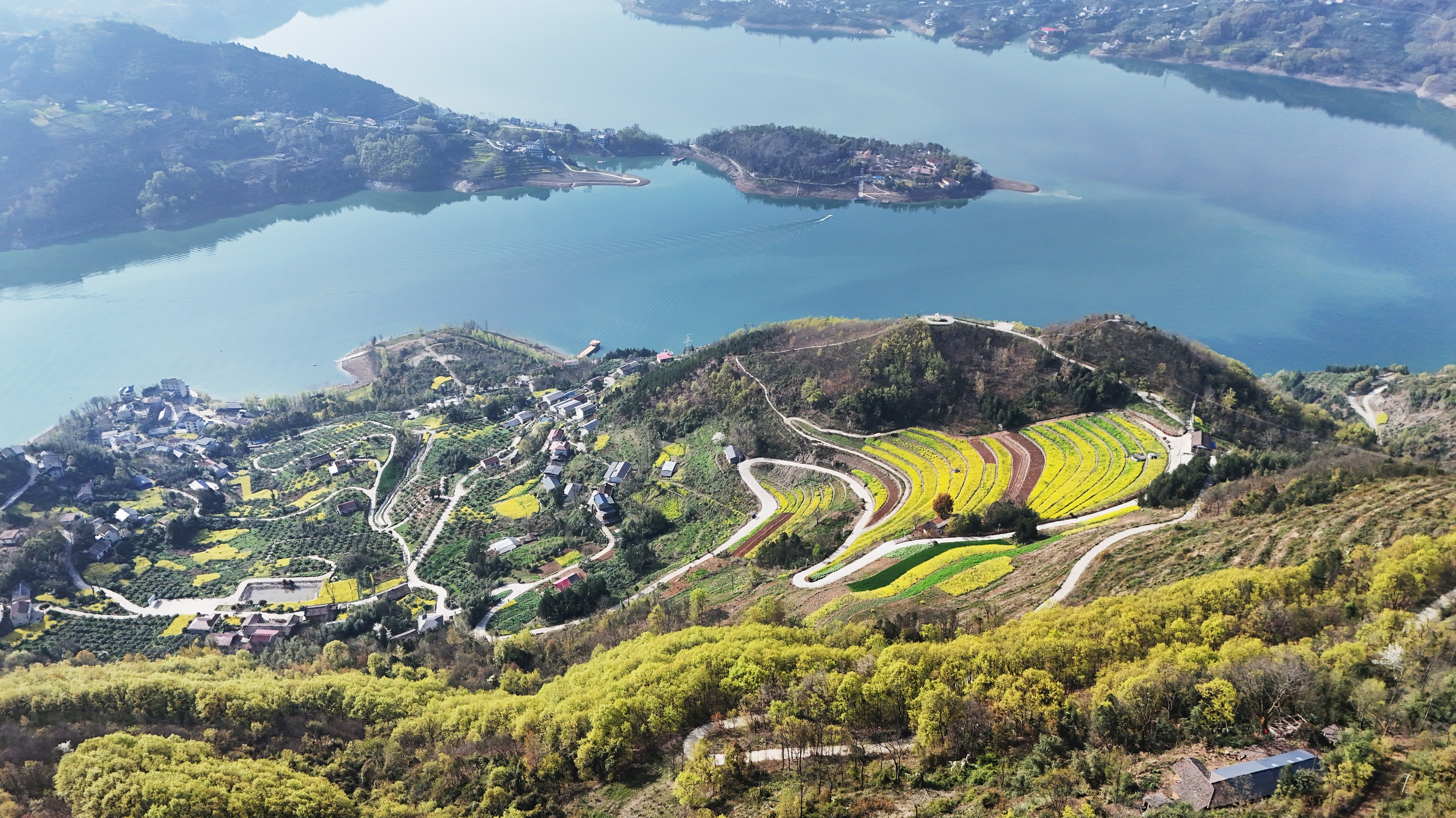 春分過(guò)后的漢江安康段沿江兩岸,桃花、櫻花、梨花、李花、油菜花等競(jìng)相綻放,宛如一幅山水畫卷。圖為3月22日拍攝的漢濱區(qū)瀛湖鎮(zhèn)郭家河村春景。  趙華斌 攝