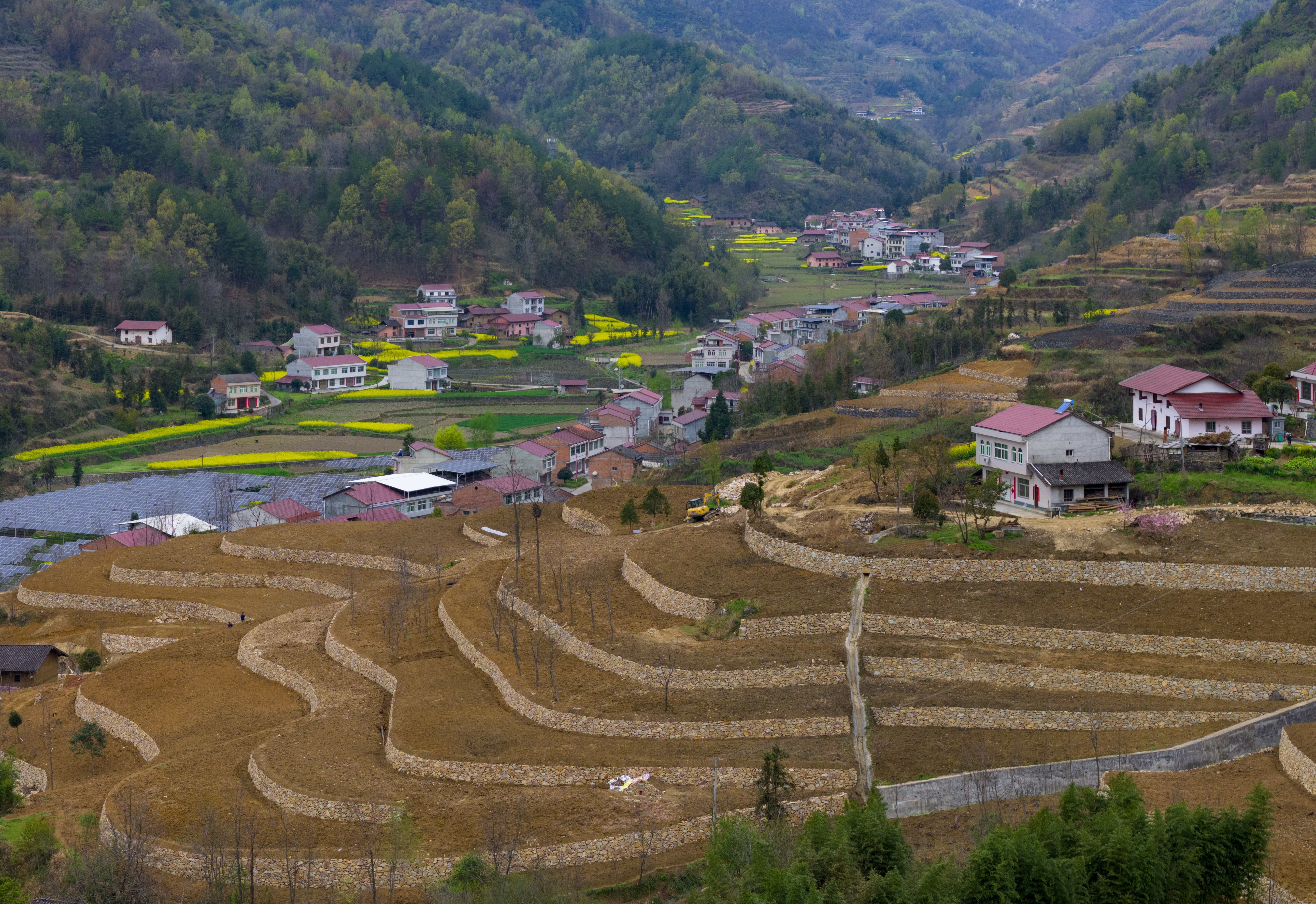 漢濱區(qū)大河鎮(zhèn)搶抓春耕有利時機(jī),組織實施坡改梯標(biāo)準(zhǔn)化農(nóng)田建設(shè),讓山間的“石坎坎兒”成為穩(wěn)定糧油增收的“金碗碗兒”。圖為該鎮(zhèn)興紅村連片320畝標(biāo)準(zhǔn)農(nóng)田建設(shè)一角。  陳均威 攝